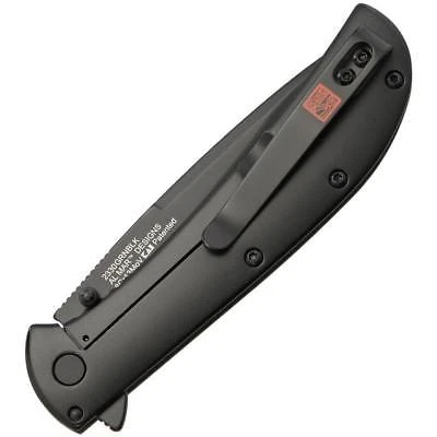 AM-4 Linerlock A/O. Assisted opening. 4.25″ closed. 3.5″ black oxide coated 8Cr13MoV stainless spear point blade. Green polished G10 handle with black stainless back handle. Extended tang. Thumb stud. Pocket clip. SpeedSafe assisted opening. Al Mar knives design. Boxed.