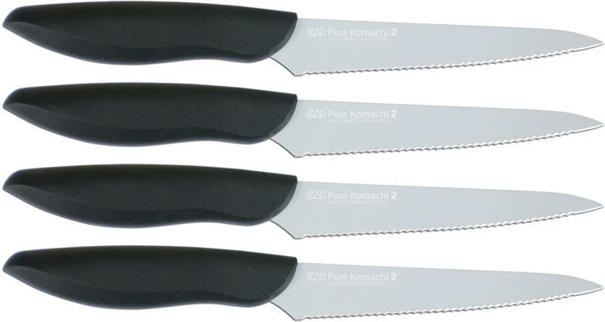 5″ serrated silver finish blade. Black handles. Four piece set. Pure Komachi 2 Series. Vibrant monochromatic colors make the Pure Komachi 2 Series a striking addition to your kitchen; but these deceptively playful colors serve a no-nonsense purpose. The high-carbon SUS420J2 stainless steel blade provides a razor-sharp edge, while the color-coding makes it easy to choose the right knife for the job. The variety of colors help guard against cross contamination of your food, making it easy to remember which blade you used on your meat and which knife was for vegetables. The bold blade color is achieved by bonding liquid coating to stainless steel blades for friction reducing. This food-safe coating resists corrosion, makes cleaning simple and helps the knife glide through food with ease. The Pure Komachi 2 color-matched lonomer-resin handles are lightweight and contoured for a comfortable, remarkably nimble performance. Incredibly sharp and distinctly attention-getting, Pure Komachi 2